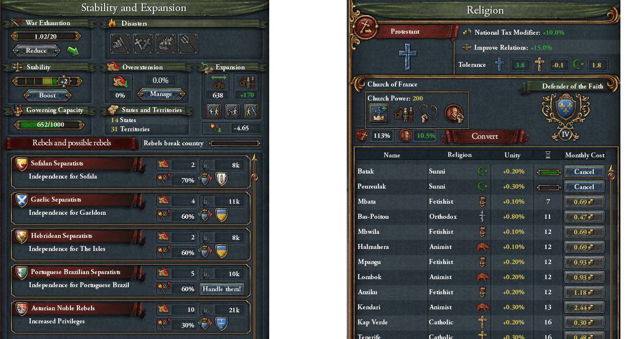 帝国級への昇格により統治キャパシティの上限が増えていくらか余裕のある状態 アジア・アフリカの州は改宗してから貿易会社に編入しているが、人文アイデア取得済みでプロテスタント化がAARの主題でもないため 改宗が追いつかなくなれば元宗教のまま貿易会社に編入することも視野に入れている