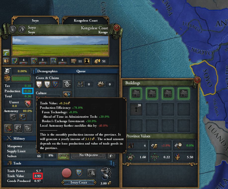 1561/12 象牙海岸ノードのKongolese_CoasTエリアで400ducats支払って貿易会社への投資"Broker's Exchange"→5州の交易品生産量+0.3&生産効率+50%