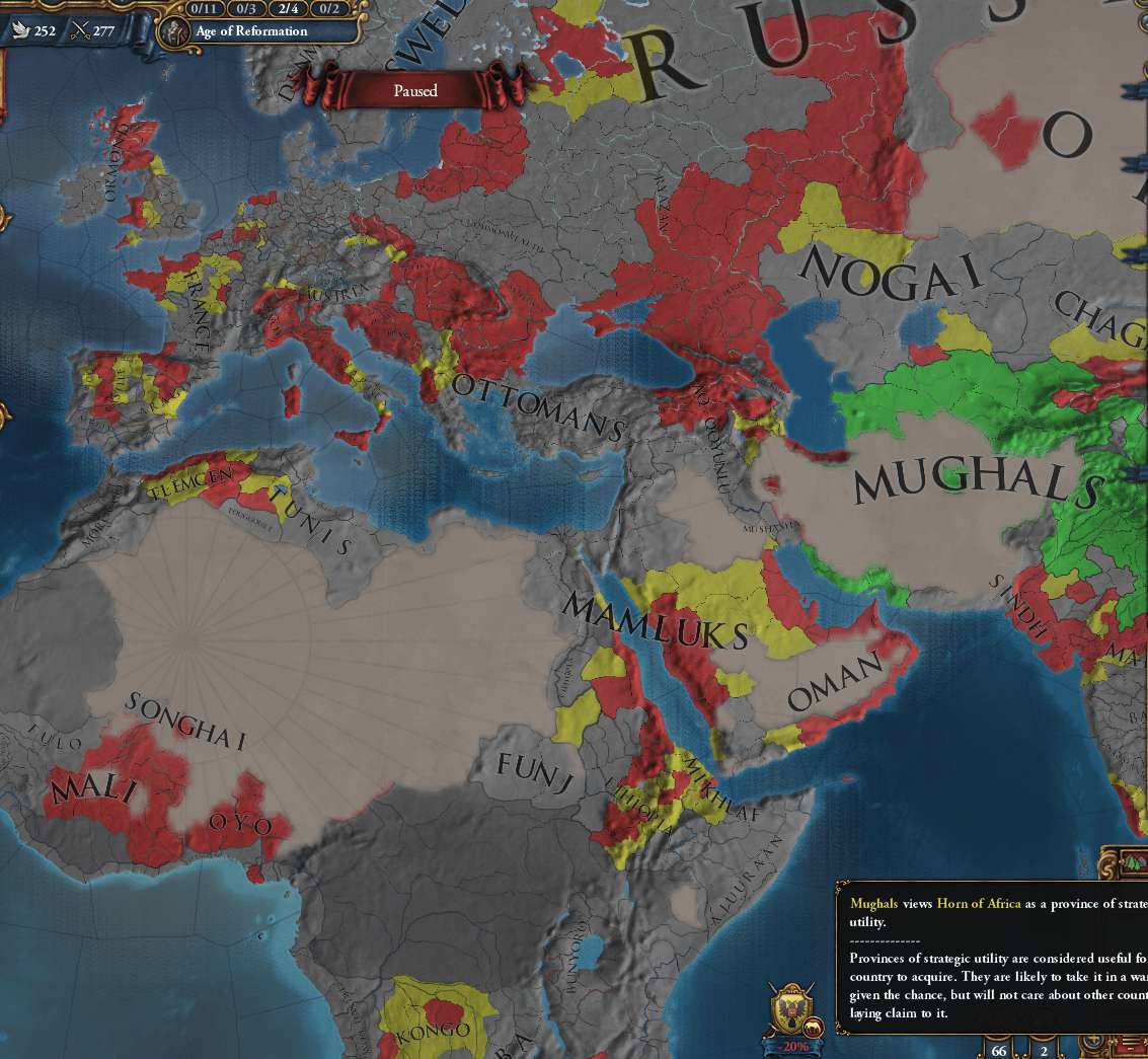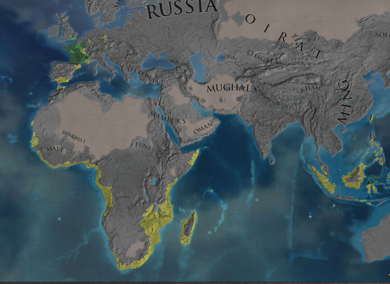 中東・インド・ステップぐらいは理解できるが、西欧やアフリカ内陸は欲張りすぎだと思う 「France領が欲しい」と「属国領が欲しい」で外交評価が-55されており、同盟を組むのは諦めることにした