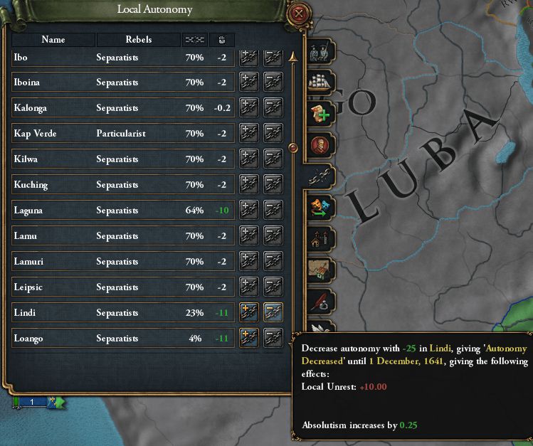 予想通り一部の貿易会社州の自治度が狂っており、自治度を下げることが可能だった LINDI州の自治度を下げると1つ上のLEIPSIC州のように23%→70%となった。州不穏度が低い州は全て同様の処理をした結果絶対主義は36まで上昇した 本AARはVer1.30.1でプレイしている。上記のような自治度の異常は不具合と思われるので、いずれ修正されるだろう