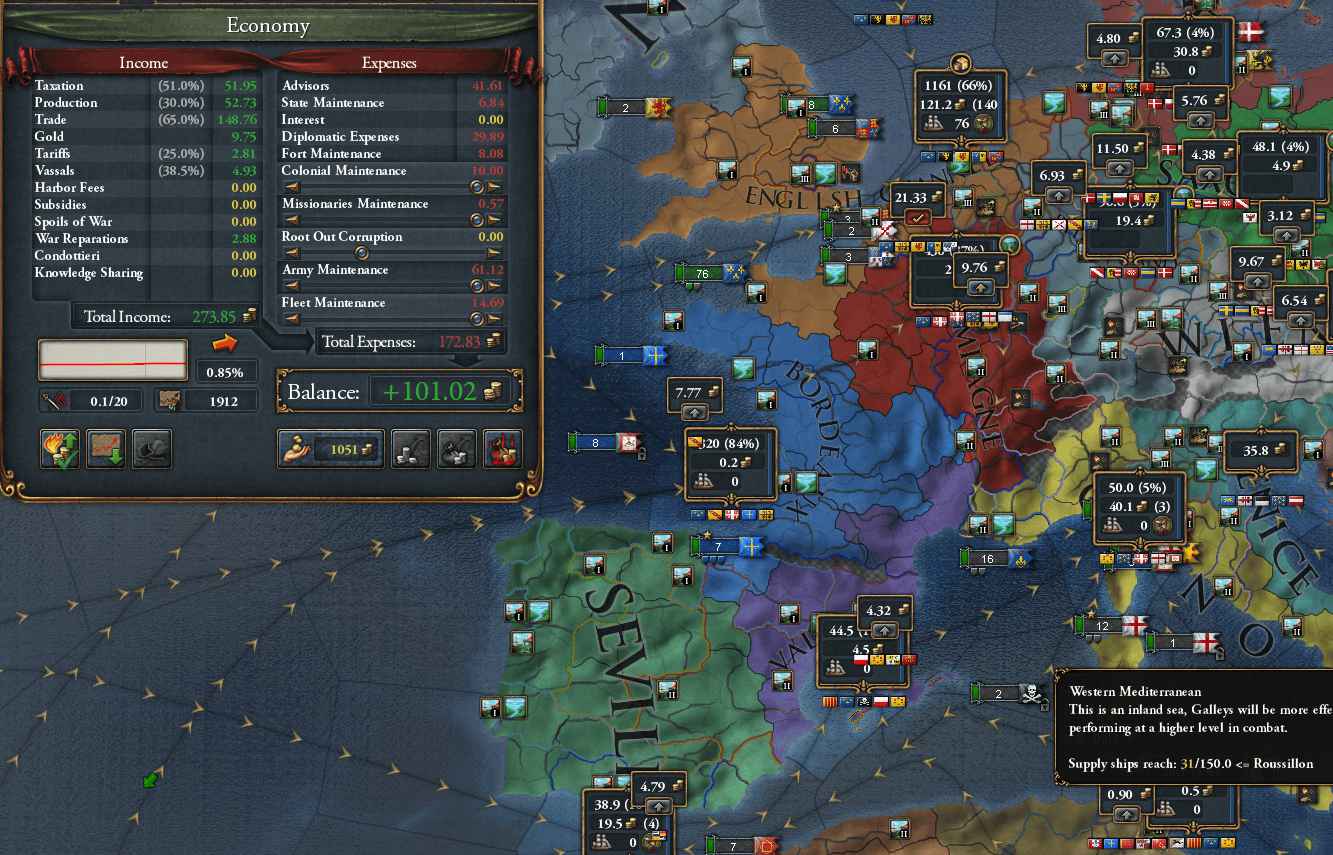属国 Ormond Asturius(辺境伯) Sicily Sunda 同盟 Ottomans Denmark Lorraine 順調に収入が増えて黒字幅も大きくなりつつある。経済覇権のためには収入を現状の4倍強まで増やす必要がある
