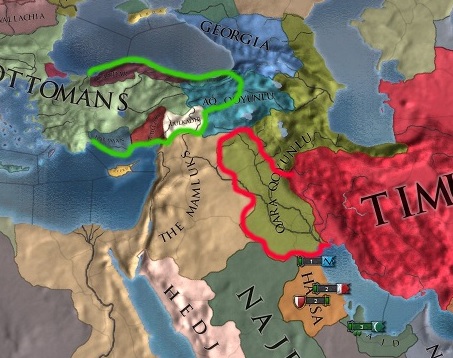 上記の線内はそれぞれオスマンとティムールが初期から領有権を主張している地域でござる。領有を主張している州を影響下においていると大幅な友好度ダウンの原因となり申す。