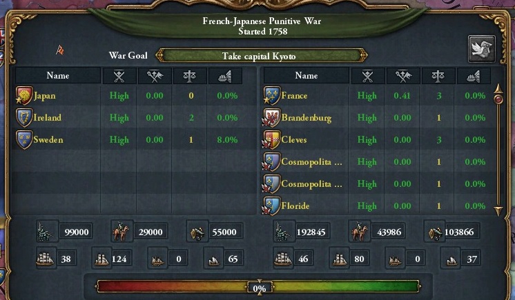 日本がイベリア半島・ブリテン島だけでなく欧州の本土たる低地地方にまで進出したことを機に、フランスを中心とする対抗同盟が成立。