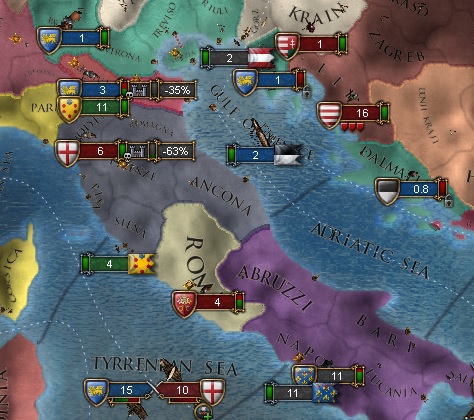 Tuscanyと連携してThe Papal Stateへ、Brugundyと連携してProvenceへ相次いで宣戦。