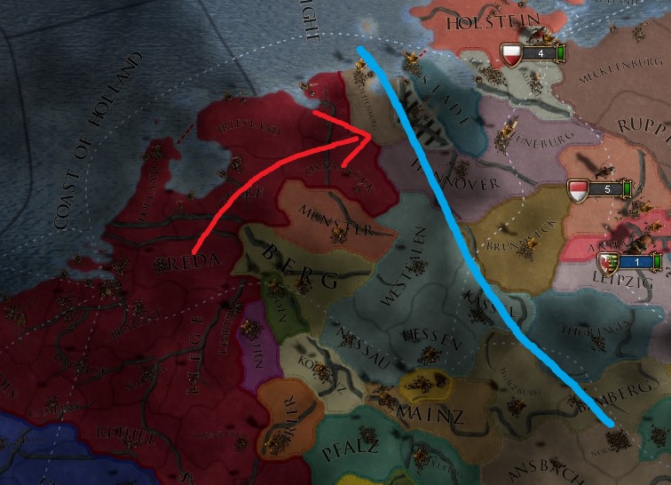 F: Burgundyが戦争中軍隊全消滅というバグにも耐えてよくやっている。ちなみに水色の線がさっき言及したWeser川だ。