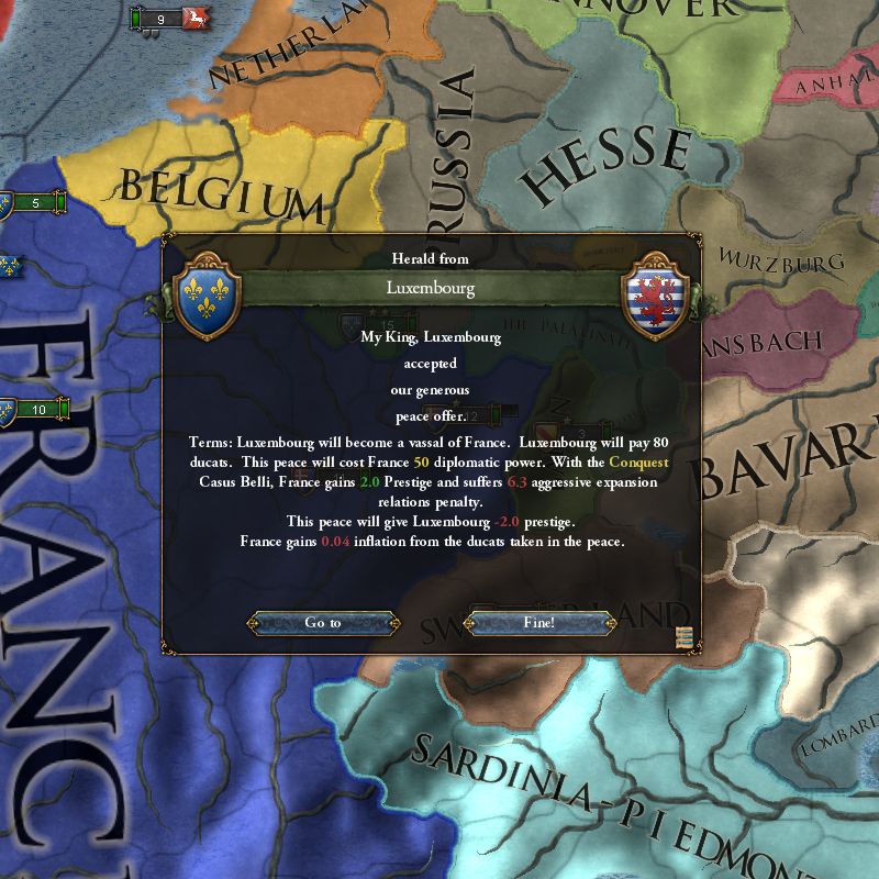 ルクセンブルクは首都のみ1プロヴィンスしか持っていないので、首都が陥落すれば War Score は100になります。