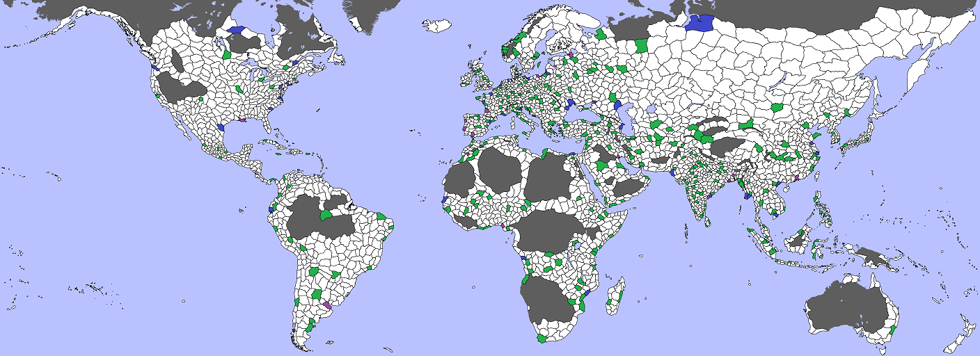 COTは緑色、エスチュワリーは青色、両者が存在するプロビは紫色で塗られています。