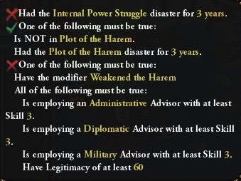 そうでない場合はこれに加えてハーレム国難発生させてないかハーレム国難を3年耐える必要があり、さらに正統性60、スキル3以上の顧問、(1.35.4より前のバージョンでは統治者の能力和が10以上)である必要があります。