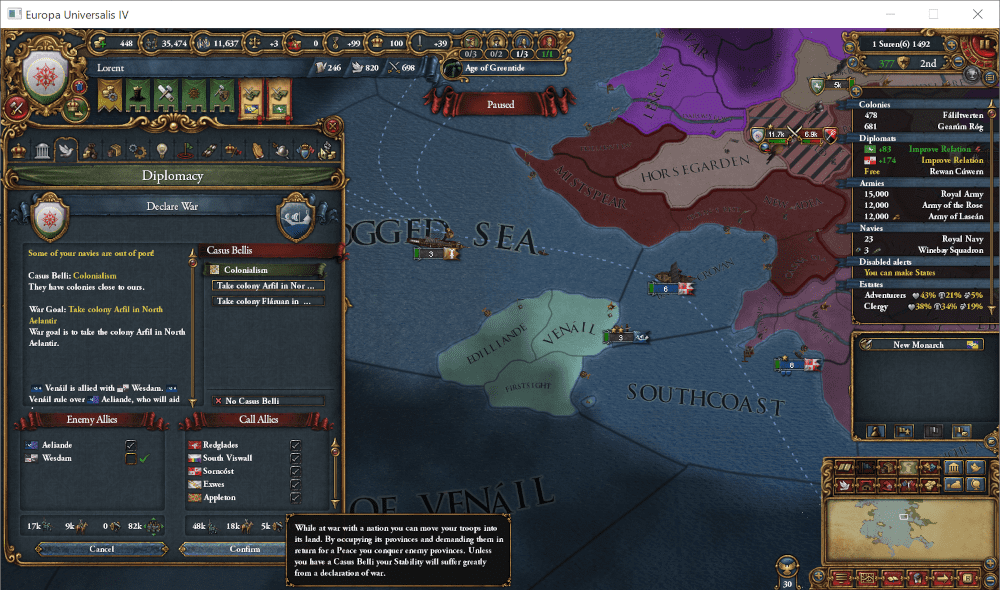 同年6月、植民地リージョンを整理するため、Venailエルフ王国に植民地主義で宣戦布告、