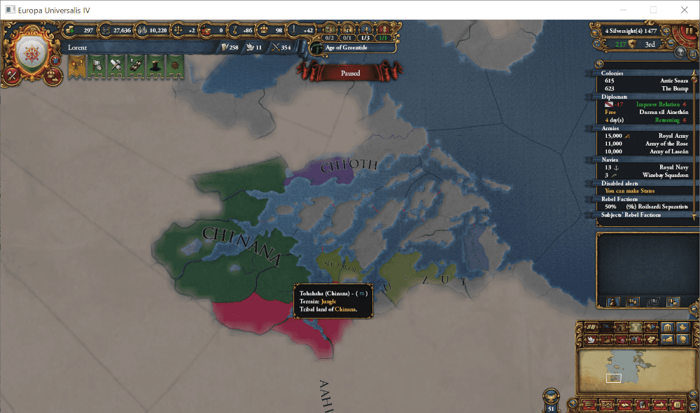 1465年10月、財政には余裕があるので2つの植民を同時並行で行います。また、この頃から他国でもAelantir大陸探索と植民が活発化し始めました。現時点でDeranne公国とVenailエルフ王国が植民活動を行っています。