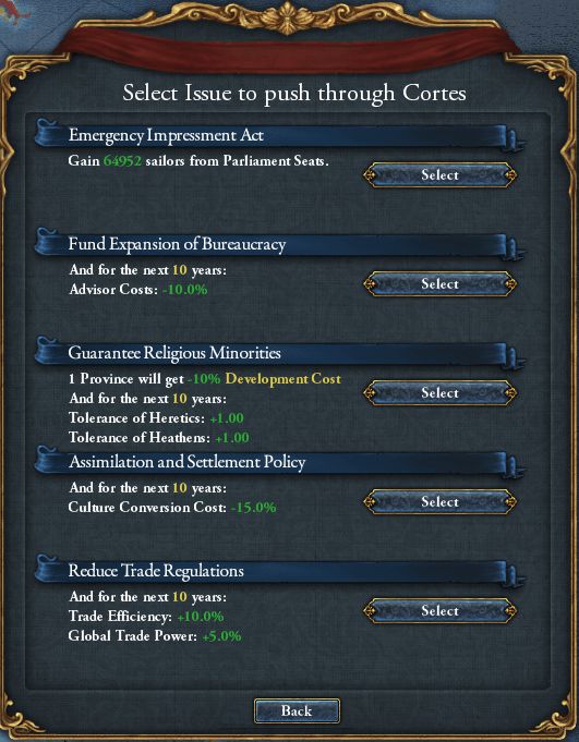 (ミッション)序盤の植民ブーストと中盤以降のGOA・MACAU関連は有用だった。他はあまり印象に残っていない (政府)結局受容文化枠を空けたままだった。こんなことなら最初のAragon戦勝利後に、サルデーニャ文化を受容文化に昇格しておけば良かった (属国)DEVポチのおかげもあって、軒並み忠実
