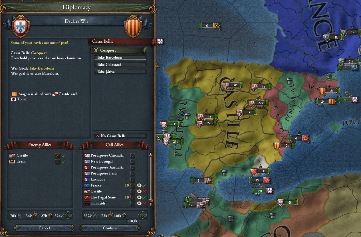 CastileはFranceとThe_Papal_Stateに加えて、Portugalとかいう国と同盟しているらしい イヤー敵ガ増エルノハ怖イナー