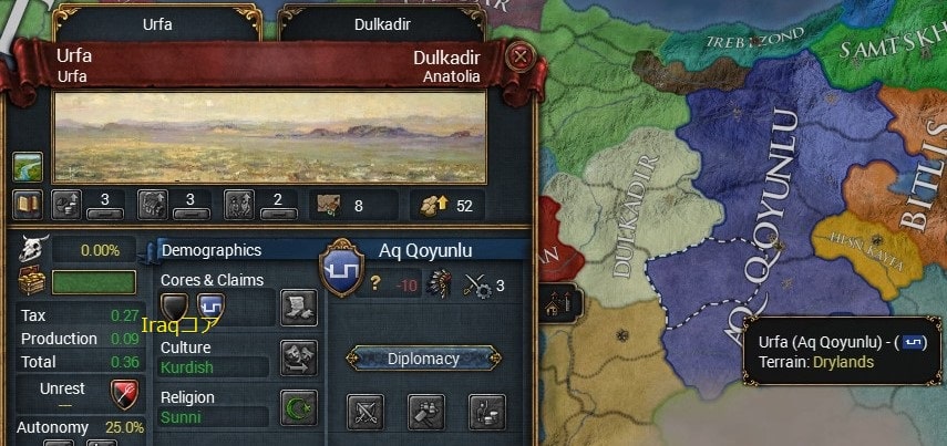 例)黒羊朝が持つUlfaにはイラクのコアがあるが、イラクの主要文化がレヴァントグループのマシュリクなのに対し、州はイラングループのクルド文化であるため、解放できない。