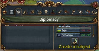 ②Diplomacyページから、Create a subjectで属国を作成する(属国作成が可能になった順番にリストアップされる)。