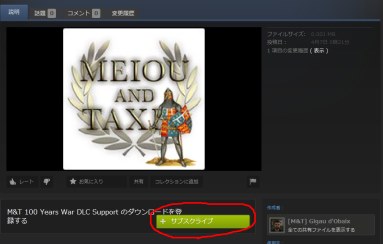 1.ワークショップで遊びたいMODを探し、下の画像の赤枠部分を押してサブスクライブする。