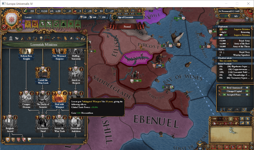 1448年2月、将軍と一時的に傭兵を雇いミッション達成、ついにワイン諸侯に宣戦布告します。最初の標的は交易中心地を二つ持っているWinesport公国です。敵同盟国含めても非常に弱いので、軽く潰します。